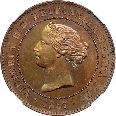 *Peck states that the decimal pattern coins of 1857 and 1859 were made in anticipation of a change to decimal currency for which there had been much agitation for the past 20 years. Coupled with this there was a growing demand for smaller, or at any rate lighter, coins, and it is obvious that several experimental bronze alloys were tried out. It is possible that the dies for this piece were engraved by James Wyon, cousin of L.C. Wyon and Resident Engraver at the Mint 1851-1860, although no designer's initials are evident on the obverse or reverse.