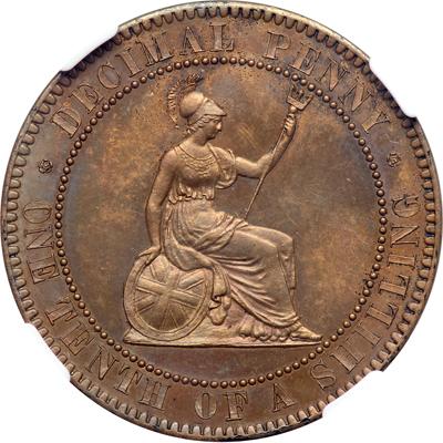 Great Britain. Pattern Penny, 1857. Peck-1968; Freeman-674. Victoria, 1837-1901. 32.5 mm. 1.75 mm thickness. Officially produced by the British Royal Mint for a proposed decimal coinage. Obverse: Portrait of Queen wearing jeweled diadem left, within circle of dots, VICTORIA D:G: BRITANNIAR: REGINA F:D: 1857 around. Reverse: Britannia seated within circle of dots. DECIMAL PENNY above, ONE TENTH OF A SHILLING below. Pleasingly toned with a deep golden mauve patina, this is a very important coin in the British copper series. In our opinion nicer than the grade given. In a new 4 prong NGC holder. NGC graded MS-62 Brown.
