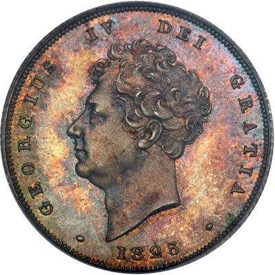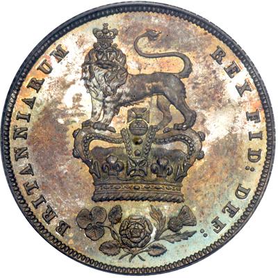 Great Britain. Pattern Proof Shilling, 1825. ESC-1264 (R-5, extremely rare, just 5 to 10 pieces known). George IV, 1820-1830. Bare head. Reverse: Small lion. Reeded edge. Seldom seen prototype for the Bare Head coinage, distinguished by a smaller crowned lion on the reverse. When the currency issues began in 1825 (and the Proof in 1826), the lion was remodeled and appears considerably larger on all other shillings of this style. This splendid coin is possibly the finest of the few known examples. Superb Proof, with marvelous violet-gold iridescence on the obverse, while the reverse displays exquisite golden blue and silvery green iridescence. A stunning classic of the Georgian Age! PCGS graded Proof 66.