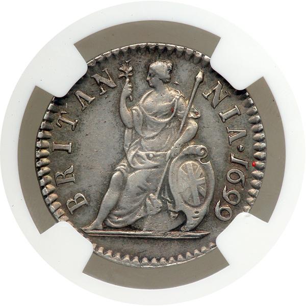 Great Britain. Pattern Silver Farthing, 1699. P-682. William III, 1694-1702. Obverse: Laureate and cuirassed bust of King right. Reverse: Britannia seated, date in legend. A superb example of this scarce silver proof specimen. NGC graded Proof 55.