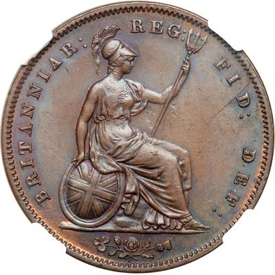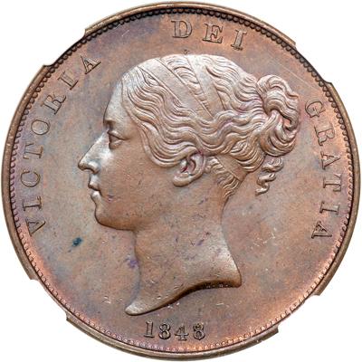 Great Britain. Penny, 1848/7. S.3948; KM-739. Victoria. Minor flan flaws. In a new 4 prong NGC holder. NGC graded MS-62 Brown.