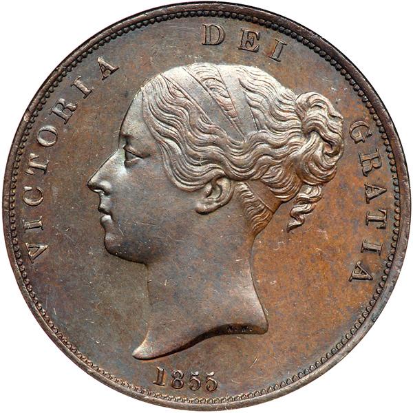 Great Britain. Penny, 1855. S.3948; KM-739. Victoria. Plain Trident. Young head. NGC graded MS-64 Brown.