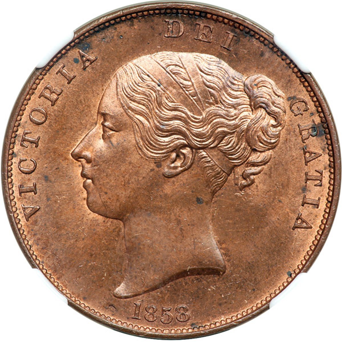Great Britain. Penny, 1858. S.3948; KM-739. Victoria. Young head. Large date without WW. NGC graded MS-64 Red & Brown.