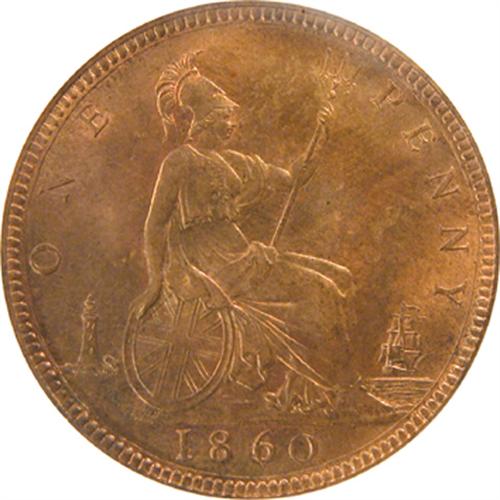 Penny 1860, Raised Shield Lines ICG MS-65 Red and Brown. A fully struck piece with great lustre on rather flawless surfaces that are about 85% red