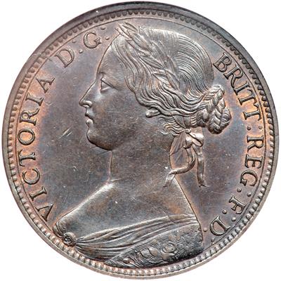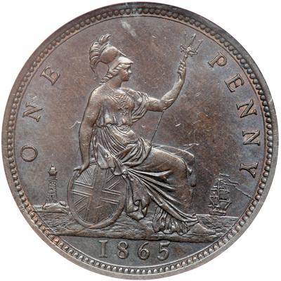 Great Britain. Penny, 1865. S.3954; KM-749.2. Victoria. Hair in bun. NGC graded MS-61 Brown.