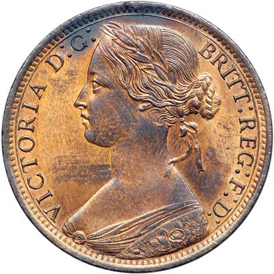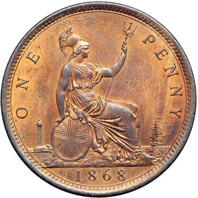 Great Britain. Penny, 1868. S.3954; KM-749.2. Victoria, 1837-1901. Wyon's young portrait of Queen with hair in bun. Reverse: Britannia right with shield and trident. A key date in the Penny series, the reverse has virtually full original color, the obverse has a tiny darker area but most mint red intact. It is so unusual to see this date in this grade. The 1868 Penny has a high catalogue value. Almost Uncirculated to Uncirculated.