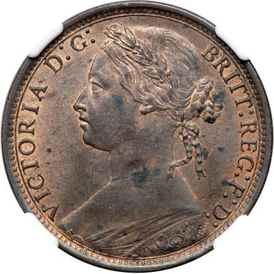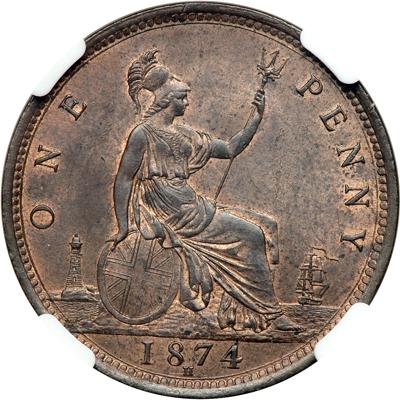 Great Britain. Penny, 1874-H. S.3955; Freeman-71 (dies 7 + G) Victoria, 1837-1901. This is a rarer variety in any grade. Especially rare in this condition. In a new NGC 4 prong holder. NGC graded MS-62 Brown.
