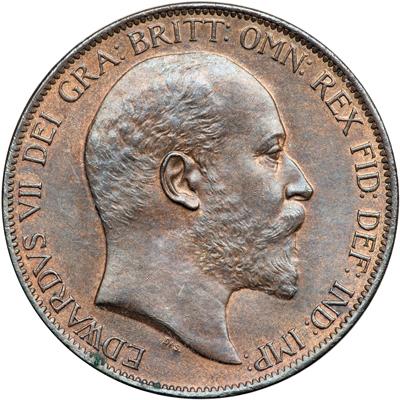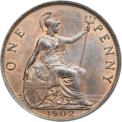 Great Britain. Penny, 1902. S.3990A; KM-794.1. Edward VII, 1901-1910. Low Tide. Obverse: Bare head of King facing right. Reverse: Britannia seated, date in exergue. This is a rare variety of Penny, with a little original luster or mint red still evident. NGC graded MS-64 Brown.