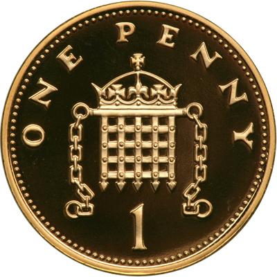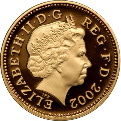 Great Britain. Penny Struck in Proof (22ct) Gold, 2002. S.PGJS1. Elizabeth II, 1952 to present. Obverse: Ian Rank Broadley's crowned portrait of HM Queen facing right. ELIZABETH. II. D.G REG.F.D.2002. Reverse: Crowned portcullis, numeral 1 and ONE PENNY. This spectacular striking in gold is normally only available in the complete 13 coin gold proof set struck in limited numbers for Queen Elizabeth's Golden Jubilee. A very rare opportunity for the collector of this popular denomination. NGC graded Proof 69 Ultra Cameo.