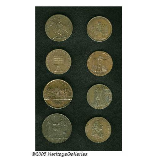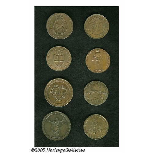 <B>Penny and Halfpenny Condor Tokens including:</B></I> Middlesex Halfpenny 1728, Skidmore Bridge-gate, UNC; Middlesex National Series Halfpenny 1795, The Wooden Walls of Old England, UNC; Middlesex Halfpenny 1795, W Williams London, UNC; Middlesex Penny 1797, Kempson's Cripplegate, XF with rim bumps, scarce; Middlesex Penny 1797, Kempson's Guild Hall, prooflike UNC with some spotting; Suffolk Bungay Halfpenny 1794, remains of an ancient fortress, UNC; Suffolk Beccles Halfpenny 1795, Church/Bridge, AU; and a Suffolk Hoxne Penny Token 1795, 293 C/S on reverse, AU. <B>A sold as is, no return lot.</B></I>