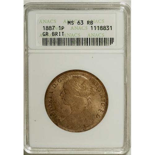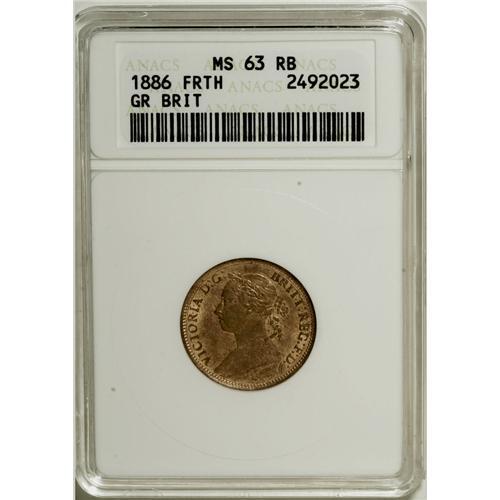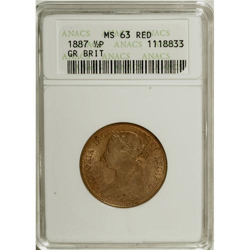 <B>Pleasing Victoria Bun Head type trio:</B></I> Penny 1887 MS63 RB, Halfpenny 1887 MS63 Red, and Farthing 1886 MS63 RB. All are in ANACS slabs. The Penny is a gem and fully red, however.<BR><BR><b>Shipping:</b> Coins & Currency (<a target="_blank" href="http://www.heritageauctions.com/common/shipping.php">view shipping information</a>)