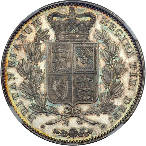 Great Britain. Proof Crown, 1839. S.3882; ESC-279; KM-741. Victoria, 1837-1901. Young Head left. The queen's hair bound with Greek-style ribbons. Reverse: Crowned shield within filleted laurel wreath; rose, shamrock and thistle spray below. Plain edge. As issued in sets. A beautiful example with light iridescent toning, glittering mirror fields, with subtle cameo frosted portrait. Very Rare as only about 300 were minted, and few have survived this fine. NGC graded Proof 64 Cameo.