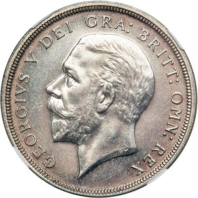 Great Britain. Proof Crown, 1932. S.4036; ESC-372; Dav-110; KM-836. George V, 1910-1936. 'Wreath' type. Obverse: Bare head of King left. Reverse: Large crown enclosed within wreath of thistles and roses. Designers initials K.G (Kruger Gray) below. A very rare date in any grade. Only 2,395 pieces made, and many were melted or circulated. Mirror fields and lightly frosted design. A study of the coin - especially the crown on the reverse will show striking detail far superior to that of a normal currency piece. Very rare. In a new NGC 4 prong holder. NGC graded Proof 62.