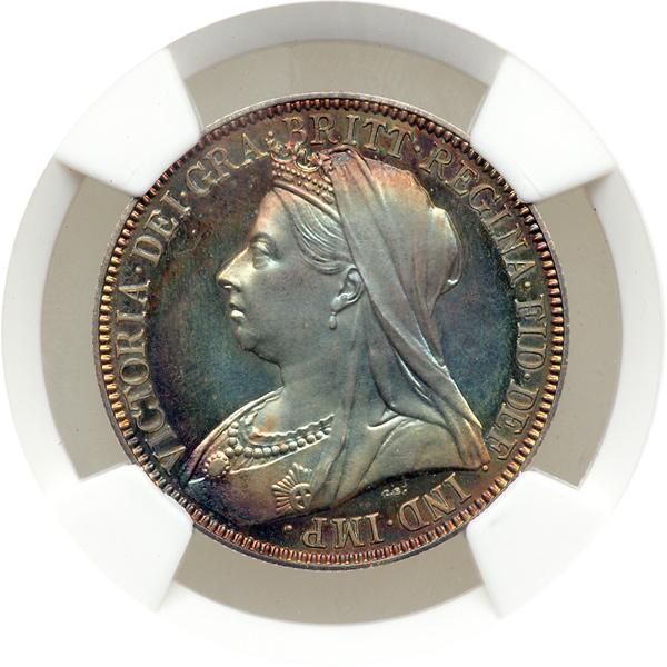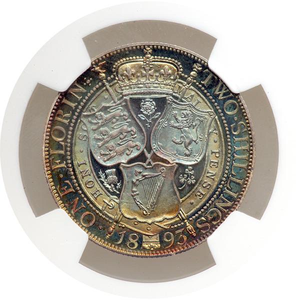 Great Britain. Proof Florin, 1893. S.3939; KM-781. Victoria. Obverse: Old head of Victoria left. Reverse: Three shields within garter, scepters behind, date below. Magnificently toned in rainbow colors this is an exceptional example, probably taken from the rare proof set struck in the Queen's Diamond Jubilee year. NGC graded Proof 67 Cameo.