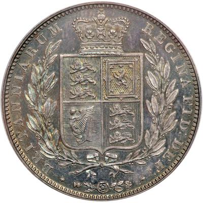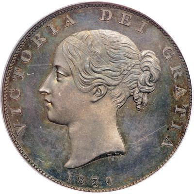 Great Britain. Proof Halfcrown, 1839. S.3887; ESC-670; KM-740. Victoria. "W.W." in relief. Plain edge. Young head. As issued in the coronation sets. Deep blue and gold iridescent toning. Rare, especially so fine as this wonderful coin. PCGS graded Proof 64.