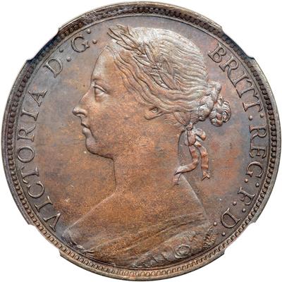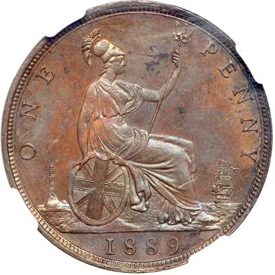 Great Britain. Proof Penny, 1889. S.3954; KM-755; Peck 1743; Freeman-129. Victoria, 1837-1901. Obverse: Wyon's portrait of Queen with hair in bun. VICTORIA D:G: BRITT: REG: F:D: Reverse: Britannia with shield and trident right. A lovely coin with a sharp edge and proof surfaces on obverse and reverse. Toning a little patchy on obverse. Freeman estimates that the rarity of this piece is R19 (2 to 5 pieces known) and although it is generally noted that the later 'bun head' Proof Pennies are not as sharply defined as the earlier Proofs they are usually rarer. In a new NGC 4 prong holder. NGC graded MS-63 Brown, Although called Mint State we believe as stated by the consignor it is a Proof.