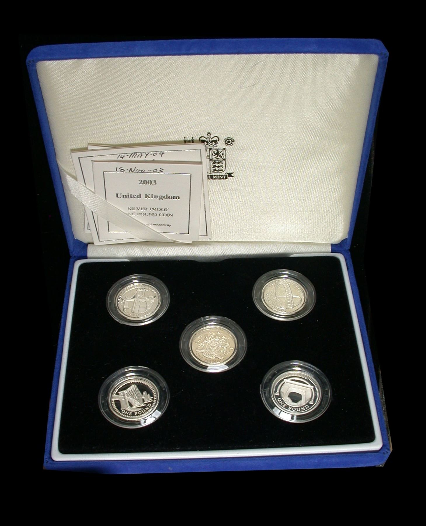 A set of 5 Proof One Pound coins in Sterling Silver, consisting of al four "Bridges" issues, 2004-2007 (KM.1048a, 1051a, 1059a, 1074a), together with a 2003 "Royal Arms" striking (KM.993a). Housed together in a blue plush Royal Mint case. (set of 5 coins)