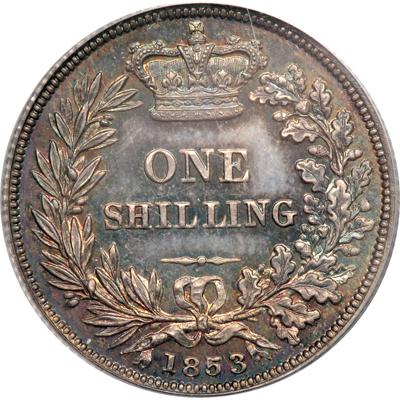 Great Britain. Proof Shilling, 1853. S.3904; ESC-1301; KM-734.1. Victoria, 1837-1901. Plain edge. Young head. Mintage unknown but very few, made for the special sets of this year. Medium gray toning with lovely iridescent hues. Rare. PCGS graded Proof 65.