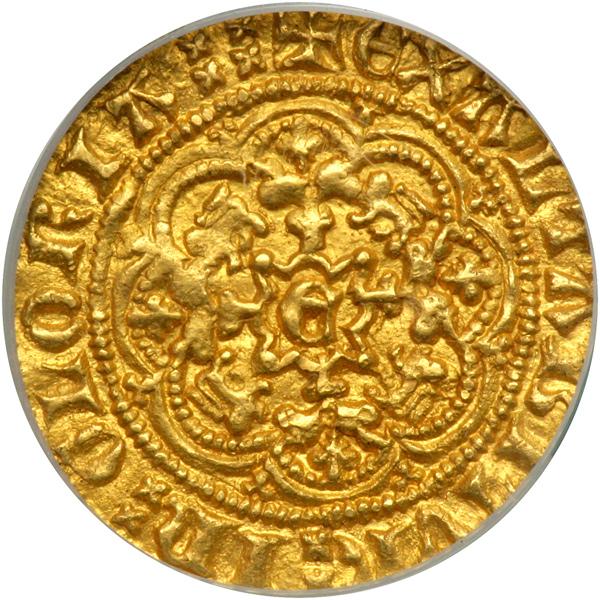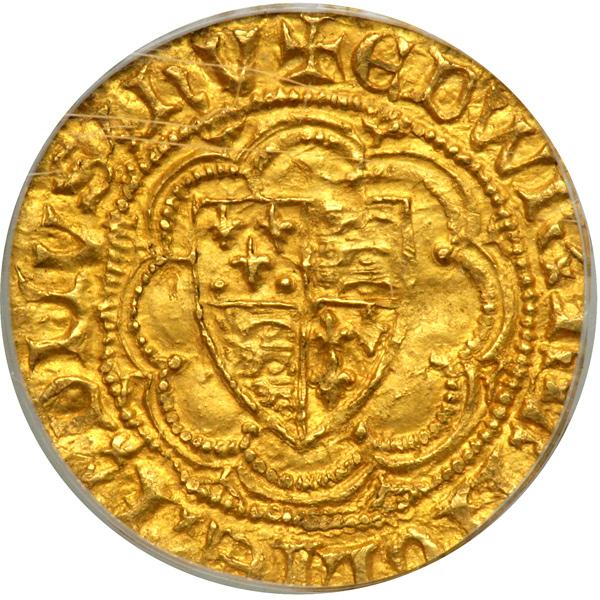 Great Britain. Quarter Noble, ND. S.1501; Fr-94. Edward III, 1327-1377. Transitional treaty period of 1361. Shield within tressure. Reverse: Ornate cross within tressure. Exceptionally nice example. PCGS graded MS-65.