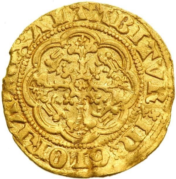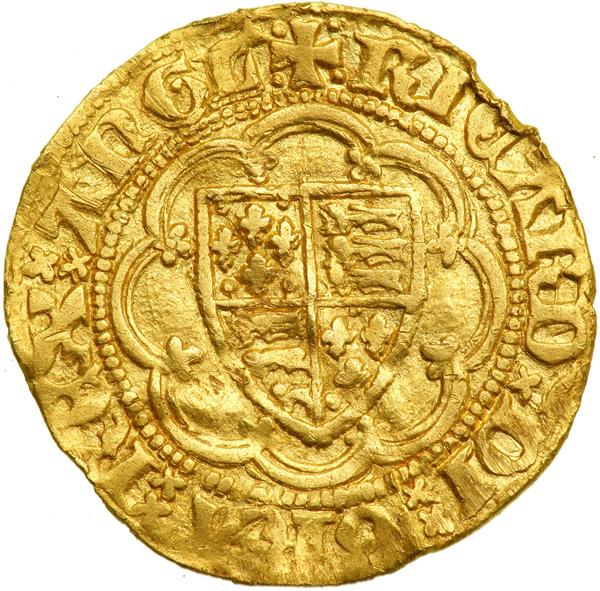 Great Britain. Quarter Noble, ND. S.1674; Fr-102. Richard II, 1377-1399. London. Shield. Reverse: Ornamental cross. Damaged, pronounced crease mark. NGC graded Extremely Fine, Details.