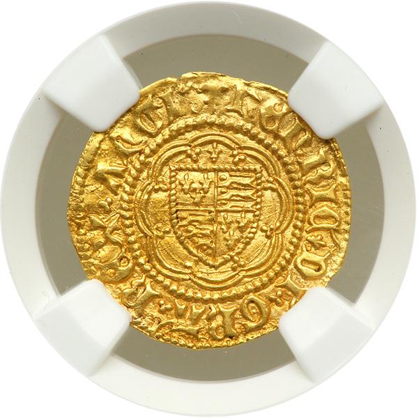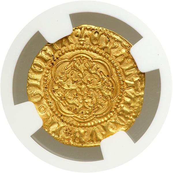 Great Britain. Quarter Noble, ND. S.1810; Fr-114. Henry VI, First Reign, 1422-1461. Annulet issue. London mint. Shield within tressure of eight arcs, lis above. Reverse: Floriated cross with lis at ends. A superb coin carefully struck on a full round flan, with considerable original luster. NGC graded MS-63.
