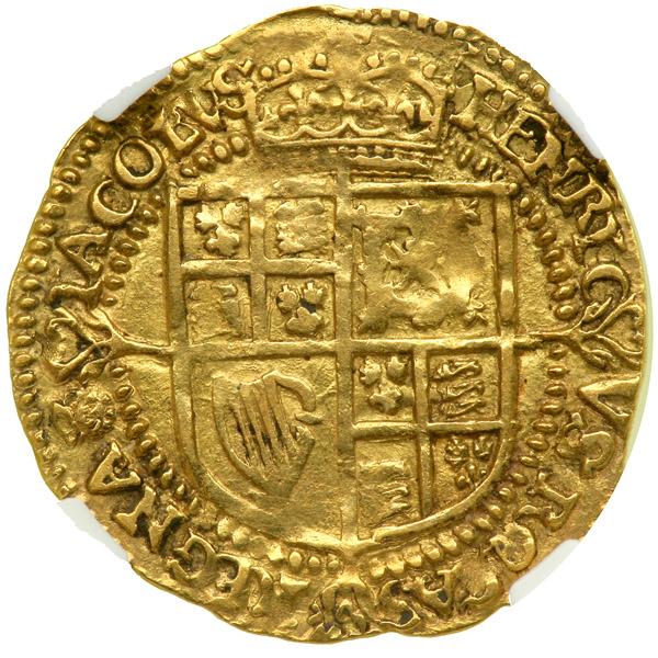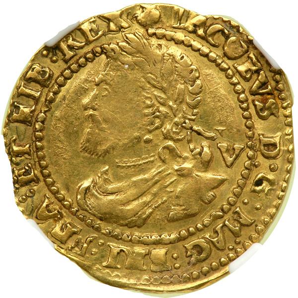 Great Britain. Quarter-laurel, ND. S.2642; Fr-244. James I, 1603-1625. Third coinage, 1619-1625. Mint mark, Thistle. Laureate bust left, value behind head. Reverse: Long cross over square shield. NGC graded EF-40.