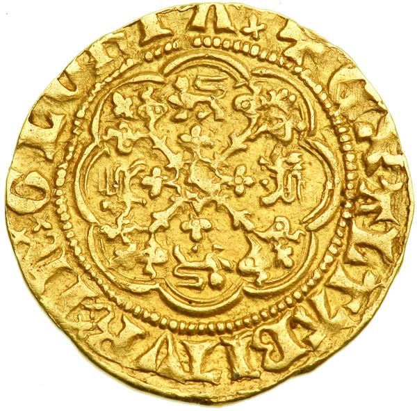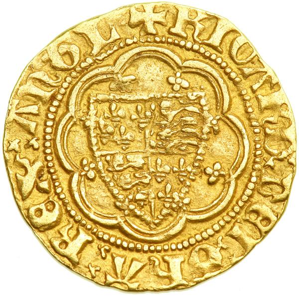 Great Britain. Quarter-noble, ND. S.1673; Fr-102. Richard II, 1377-1399. Arms. Reverse: Ornamental cross. Mount removed. NGC graded Extremely Fine, Details.