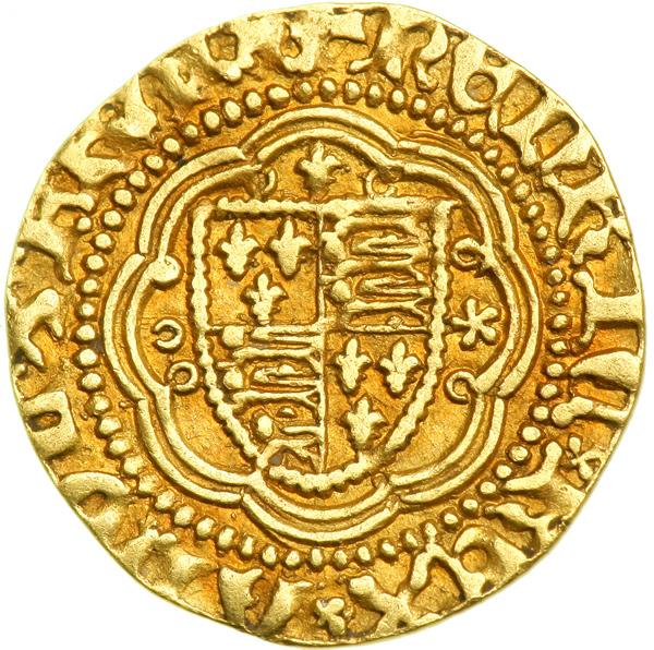Great Britain. Quarter-noble, ND. S.1754; Fr-111. Henry V, 1413-1422. Arms. Reverse: Ornamental cross. Planchet clipped. NGC graded Extremely Fine, Details.