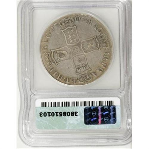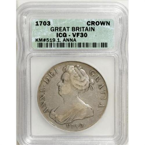 <B>Queen Anne Crown 1703-Vigo,</B></I> S-3576, Pre-Union issue, classic hallmark to denote specie taken from the Spanish at Vigo Bay, VF30 ICG, a nice enough example for a VF, having smooth and medium-gray toned surfaces, probably cleaned ages ago but now having a good look.<BR><BR><b>Shipping:</b> Coins & Currency (<a target="_blank" href="http://www.heritageauctions.com/common/shipping.php">view shipping information</a>)