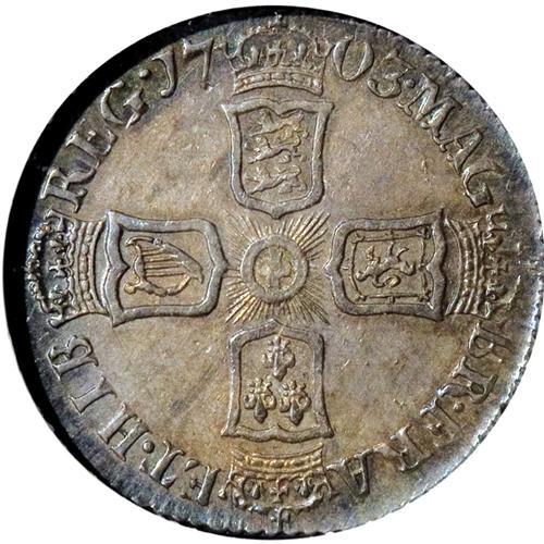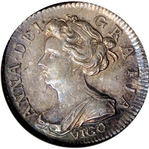 <B>Queen Anne Sixpence 1703-VIGO,</B></I> S-3590, MS63 NGC, a luxurious coin having a crisp strike and especially beautiful mauve and deep blue iridescent toning, jumbo denticles on the obverse and wide rims (without much in the way of denticles) on the reverse. The fields are nearly flawless. Anne's portrait is medallic in sharpness, and the reverse shield detailed in depth. This cataloguer has looked at countless British coins over the past 30 years, and cannot recall ever seeing a finer Vigo sixpence. Catalogue valuation is fairly modest (about $650 in XF grade) but a coin of this caliber is difficult to estimate in value. We sold an Anne Vigo shilling, virtually MS but gorgeous, not long ago at auction for nearly $5,000. We will put a middle-range estimate on this beauty and let bidders decide how much the finest quality is worth to them.<BR><BR><b>Shipping:</b> Coins & Currency (<a target="_blank" href="http://www.heritageauctions.com/common/shipping.php">view shipping information</a>)