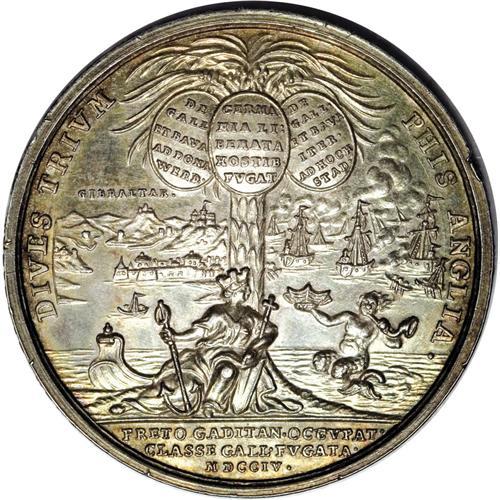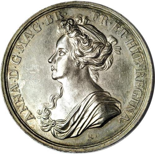 <B>Queen Anne silver "British Victories" medal 1704,</B></I> Eimer-411, nearly As Struck, little evident loss of detail, deeply engraved with a high-relief portrait showing superb detail, high rims, bold Lettered Edge. Diameter 40 mm. Design by Hautsch, whose initial appears below the queen's portrait. Engraving on the reverse is especially superb, showing a naval battle scene to the right of a giant palm tree bearing victory shields, and to left "GIBRALTAR" depicted as gateway to the Mediterranean. Beneath the palm tree, Britannia receives the fruits of victory from Neptune. A splendid piece, rife with patriotic symbolism, struck in the same year as the monumental Battle of Blenheim, which brought the Duke of Marlborough to great prominence and gave to his family, through royal charter in perpetuity, the famous family home named after the battle. It was also during this reign that Sarah Churchill became the queen's favored advisor in most matters of state and of society. Anne's was a reign of great prosperity and social elegance. This piece captures that spirit magnificently.<BR><BR><b>Shipping:</b> Coins & Currency (<a target="_blank" href="http://www.heritageauctions.com/common/shipping.php">view shipping information</a>)