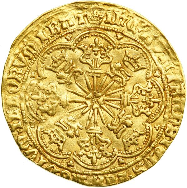 Great Britain. Ryal or Rose Noble, ND. S.1950; Fr-132. Edward IV, First Reign, 1461-1470. London mint. King standing facing in ship holding sword and shield, rose on ship's side, banner inscribed E at ship's stern. Reverse: Rose upon a radiate sun in center of floriate cross, large fleurs in spandrels. NGC graded EF-45.