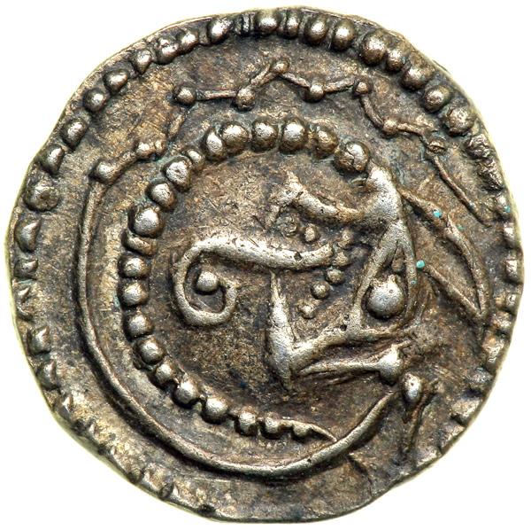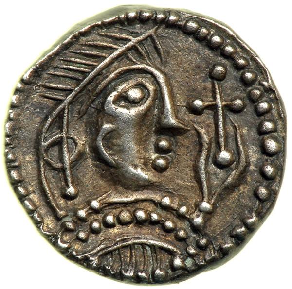 Great Britain. Sceata, ND. S.803C (798); North-89; BMC-32A. Series K. Early Anglo-Saxon period, c.600-775. Bust right with cross before. Reverse: Wolf curled head to tail. Rare. NGC graded EF-45.