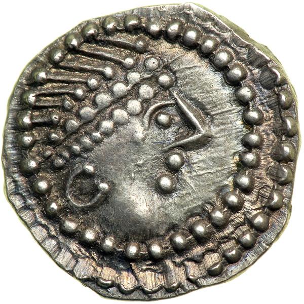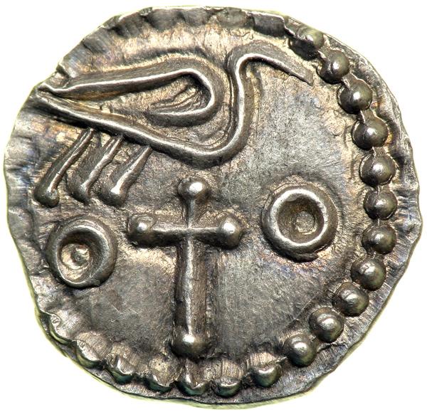 Great Britain. Sceata, ND. S-802 (791); North-126 var. Series J. Early Anglo-Saxon period, C.600-775. Large diademed head right Reverse: Bird above Cross. NGC graded MS-61.