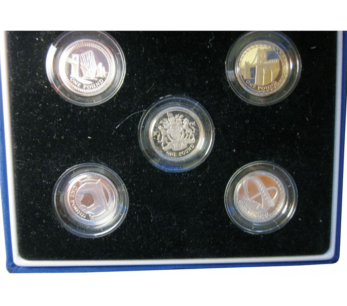 Great Britain; Set of 5 x 1 Pound Proof in original case with COA from Britiah Mint, 2003, 2004, 2005, 2006 & 2007 ,9584 Silver Bridge theme on 4 of the coins.