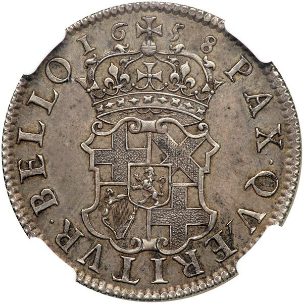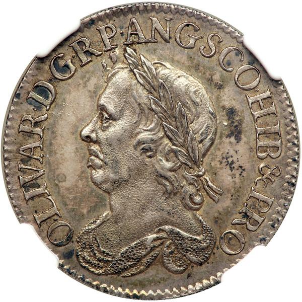 Great Britain. Shilling, 1658. S.3228; ESC-1005. Oliver Cromwell. Laureate and draped bust left. Reverse: Crowned shield. Sharply struck with steel gray toning. NGC graded MS-64.