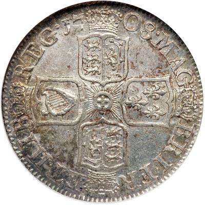 Great Britain. Shilling, 1708. S.3610; ESC-1147. Queen Anne. Third draped bust of Queen facing left. Reverse: Crowned cruciform shields, fields plain. Lustrous. PCI graded MS-62.