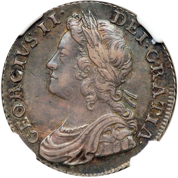 Great Britain. Shilling, 1736/5. ESC-1199A (Rarity-2); S.3700. George II. Young head left. Reverse: Roses and Plumes. Spink catalog value in EF 850£ (approximately $1,300). Lovely old cabinet toning with considerable underlying luster.