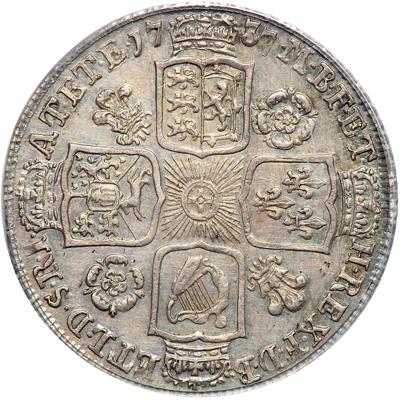 Great Britain. Shilling, 1737. S.3699; ESC-1200. George II. Young laureate and draped bust left. Reverse: Roses and plumes in angles. Toned. PCGS graded AU-55.