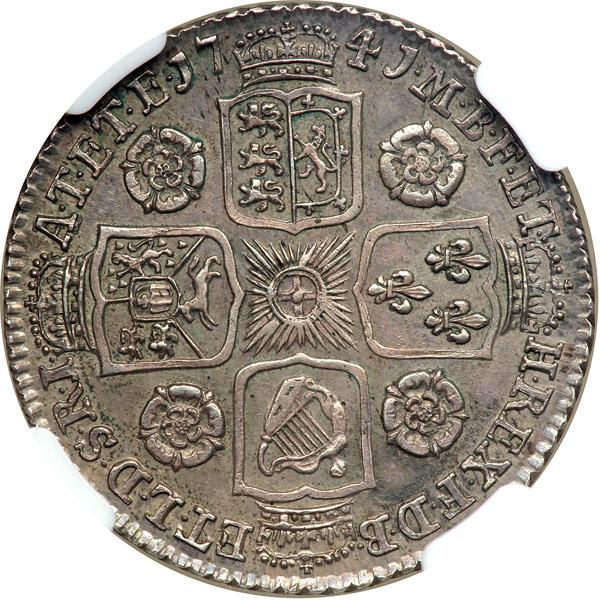 Great Britain. Shilling, 1741. S.3701; ESC-1202. George II, 1727-1760. Young laureate draped and armored bust left. Reverse: Cross of crowned shields with roses in the angles. This is an exceptional coin and in our opinion conservatively graded. Sharp fully struck example with no marks in the fields and lovely original old toning. NGC graded MS-62.