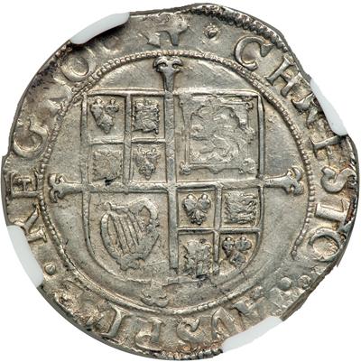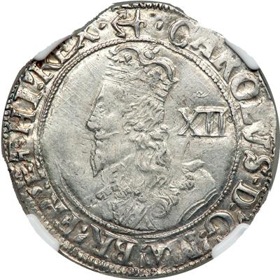 Great Britain. Shilling, ND. S.2796. Charles I, 1625-1649. Tower mint, under the King. Mint mark, Anchor. Obverse: Large bust of King left, with rounded shoulder XII to right. Reverse: Square topped shield of Stuart arms. Some original luster and a good portrait. Struck on a good flan. Overall, a pleasing piece. In a new 4 prong NGC holder. NGC graded AU-53.