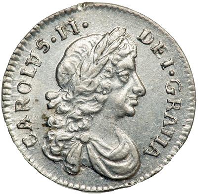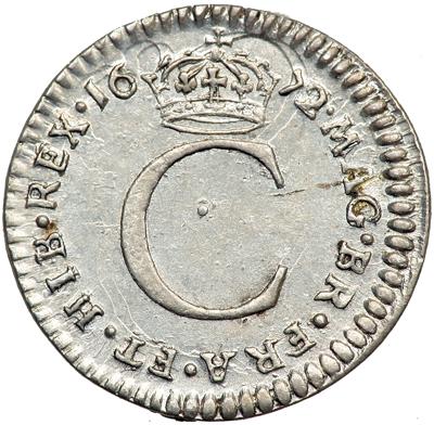 Great Britain. Silver Penny, 1672/1. S.3390. Charles II, 1660-1685. Obverse: Draped laureate bust of King right. Reverse: Crowned single C to denote denomination. Silky and lustrous with exceedingly sharp detail. Almost Uncirculated to Uncirculated.
