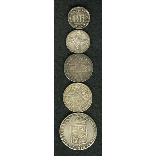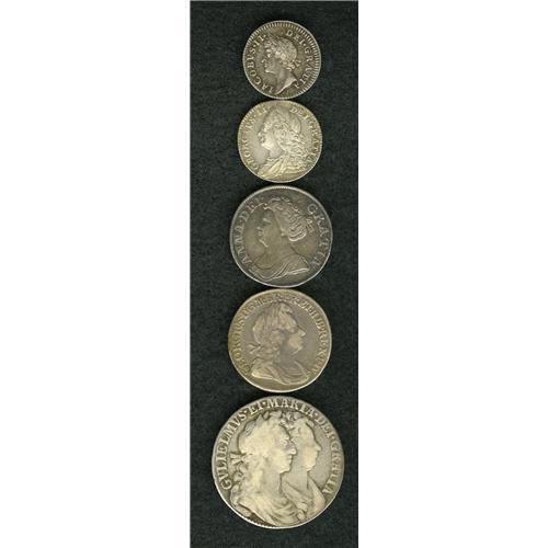 <B>Silver type lot:</B></I> James II Fourpence 1687/6, S-3414, VF; William & Mary Halfcrown 1689, S-3434, Fine; Anne Shilling 1711, plain angles, S-3610, an exceptionally nice Fine; George I Shilling 1723 SSC, also a pleasing Fine; and George II Sixpence 1757, nearly VF. All have similar light to medium gray toning.<BR><BR><b>Shipping:</b> Coins & Currency (<a target="_blank" href="http://www.heritageauctions.com/common/shipping.php">view shipping information</a>)