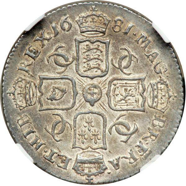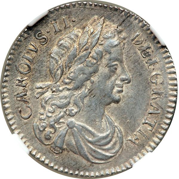 Great Britain. Sixpence, 1681. S.3382; ESC-1520. Charles II, 1660-1685. A crisply struck coin with an attractive tone. No sign of the weaknesses often seen in the production of these early milled sixpences. Overall, a high quality specimen. NGC graded AU-55.