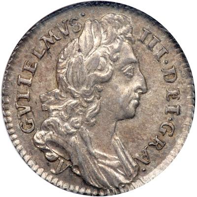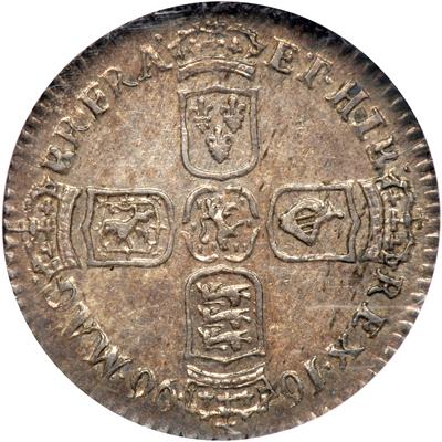 Great Britain. Sixpence, 1696-Y. S.3525; ESC-1539. William III, 1694-1702. York mint. First draped bust right. Reverse: Crowned cruciform shields, early harp. Toned. NGC graded MS-62.