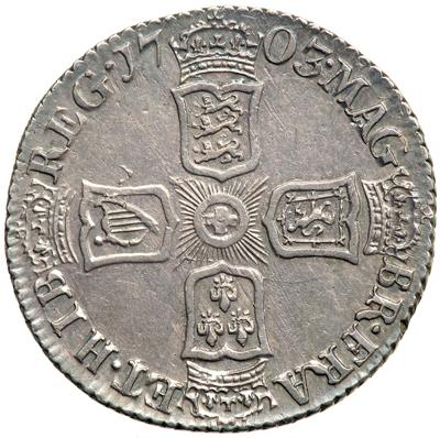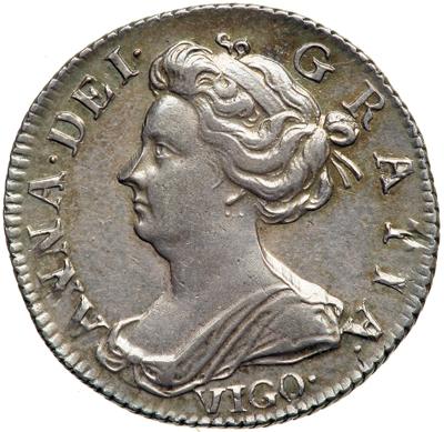 Great Britain. Sixpence, 1703. S.3590. Anne, 1702-1714. VIGO below bust. Light hairlines beneath lovely toning. Extremely Fine.