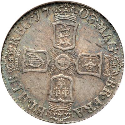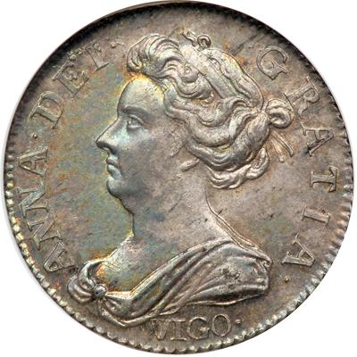 Great Britain. Sixpence, 1703. S.3590; ESC-1582. Queen Anne. Vigo below bust. Lovely deep old toning. NGC graded MS-62.