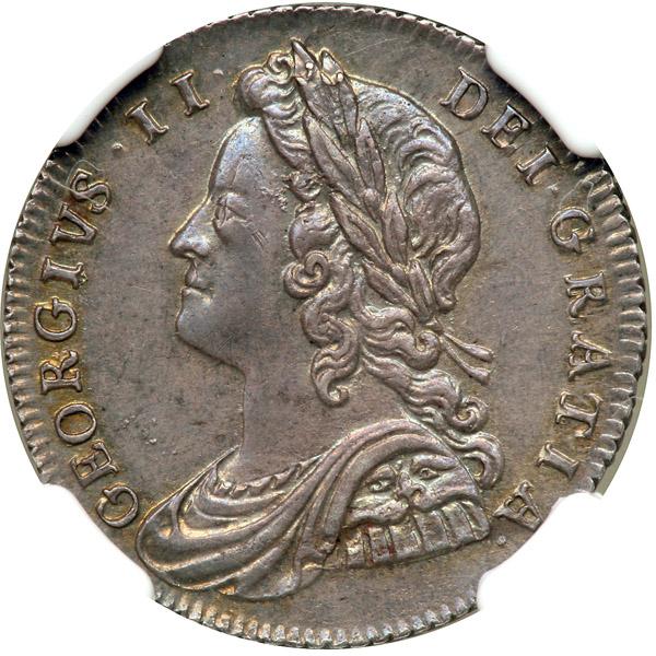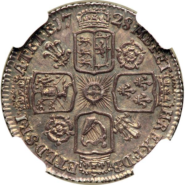 Great Britain. Sixpence, 1728. S.3707; ESC-1606. George II, 1727-1760. Young laureate draped and armored bust left. Reverse: Cross of crowned shields, with roses and plumes in the angles. A lovely original mint state example in our opinion conservatively graded with old time original toning. Very difficult to find this nice. NGC graded MS-62.