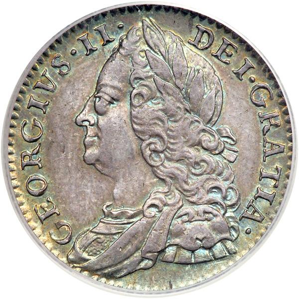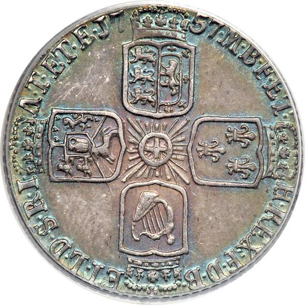 Great Britain. Sixpence, 1757. S.3711; KM-582.2. George II. Old head. Reverse: Angles plain. Lovley old toning. PCGS graded MS-62.