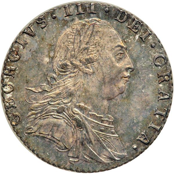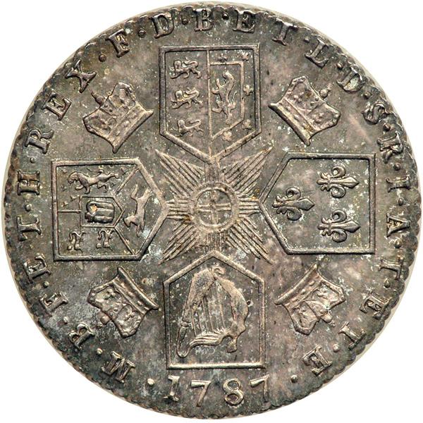Great Britain. Sixpence, 1787. S.3749; KM-606.2. With hearts. George III. Older laureate draped bust of King right. Reverse: Cruciform shields with crowns in angles. Beautifully toned in shades of blue and gold, and crisply struck. Very scarce thus. Uncirculated.